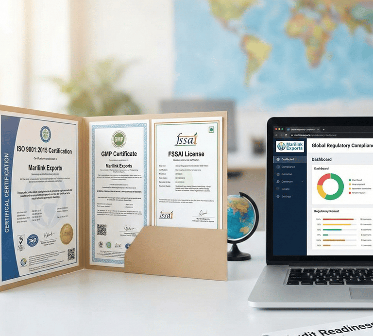 Navigate international markets with confidence. Our operations are aligned with global regulatory frameworks. We supply products backed by key industrial certifications - including ISO, GMP, and FSSAI, ensuring that your supply chain remains compliant, safe, and audit-ready.